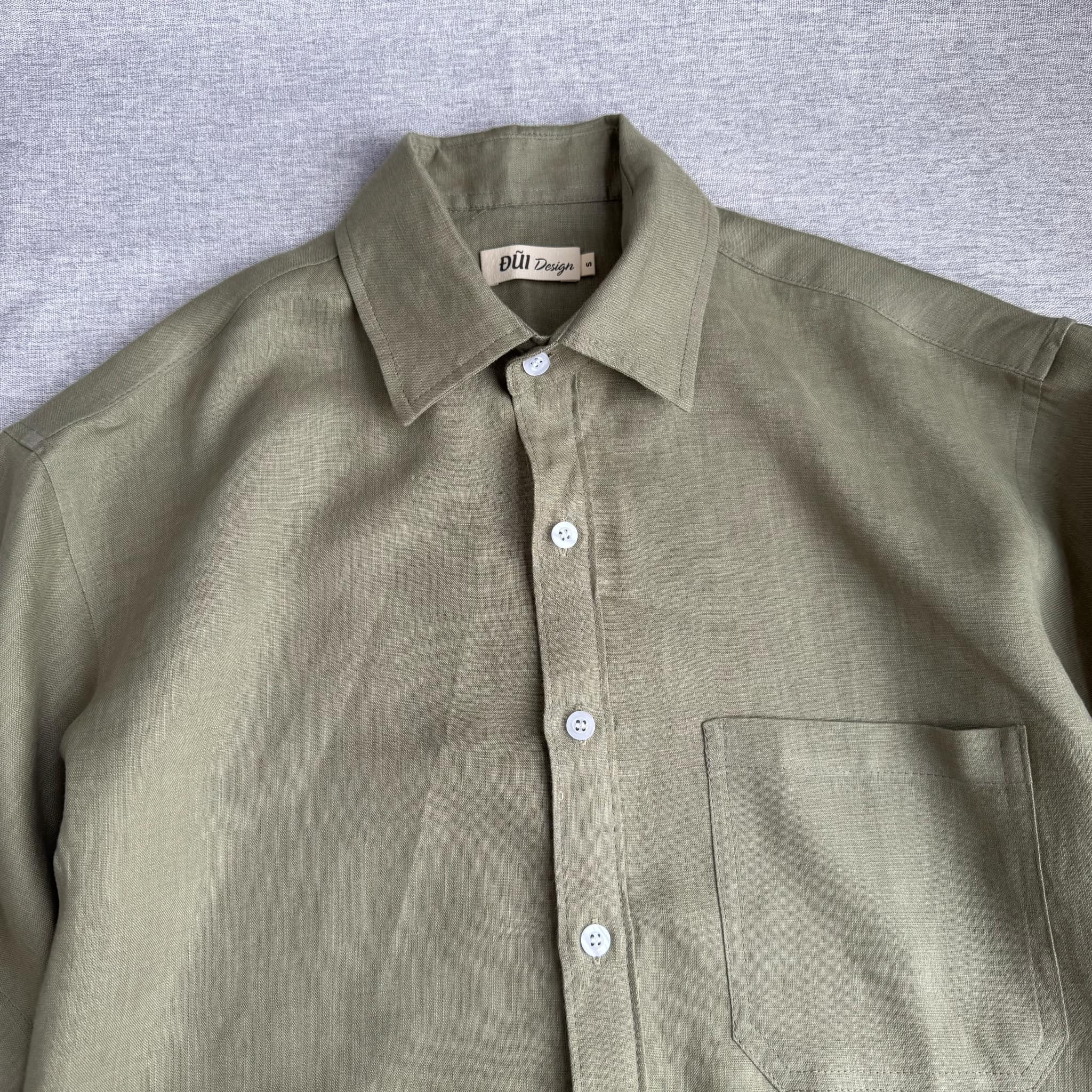 Áo đũi nam cài khuy cổ bẻ cộc tay xanh olive