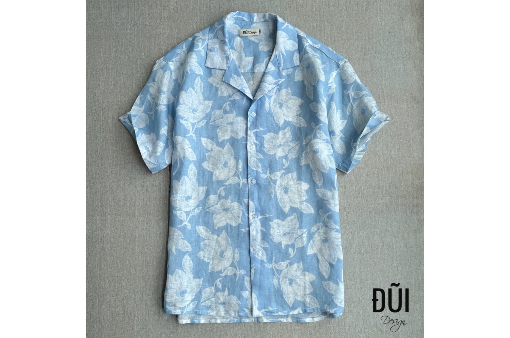 Áo đũi nam cài khuy cổ Hawaii cộc tay hoa xanh